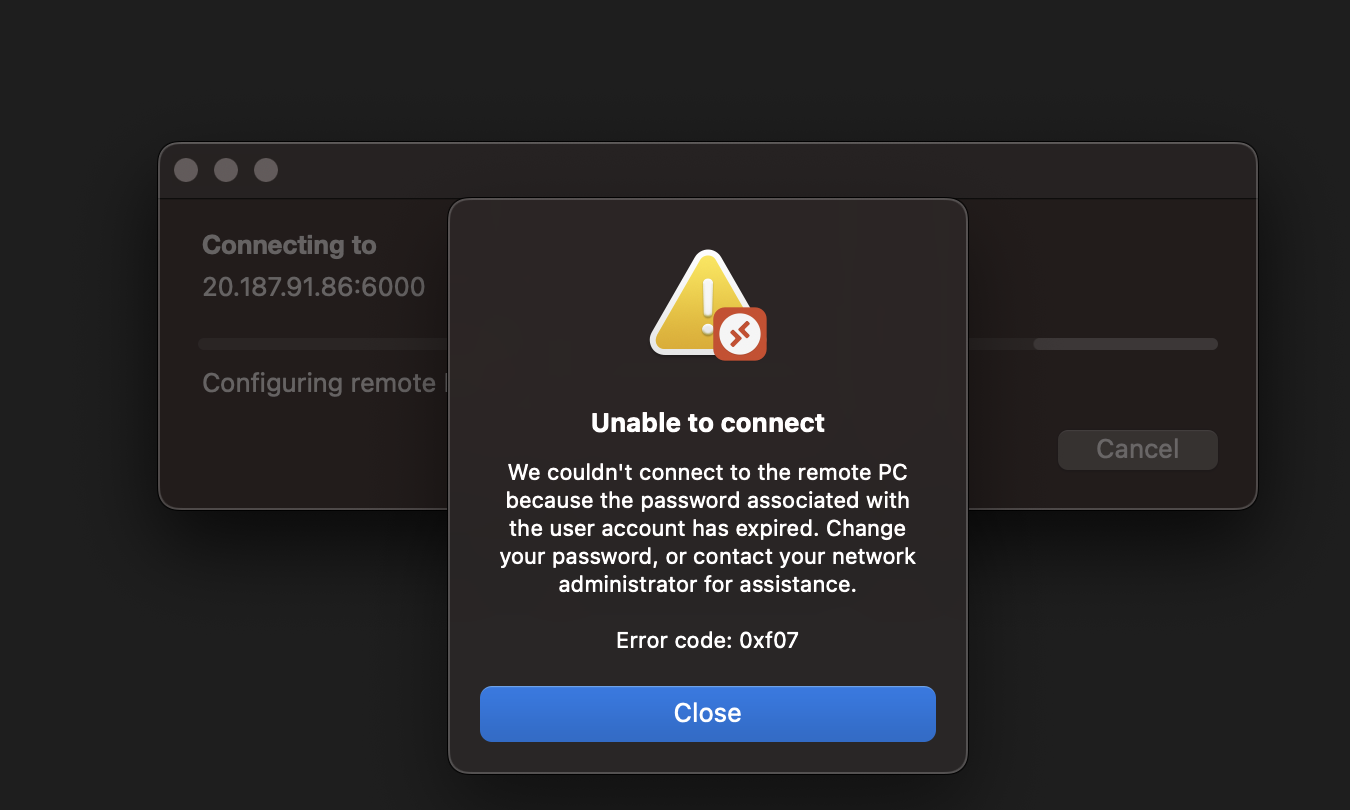 使用macOS上的RDP客户端连接PC时,显示以下错误